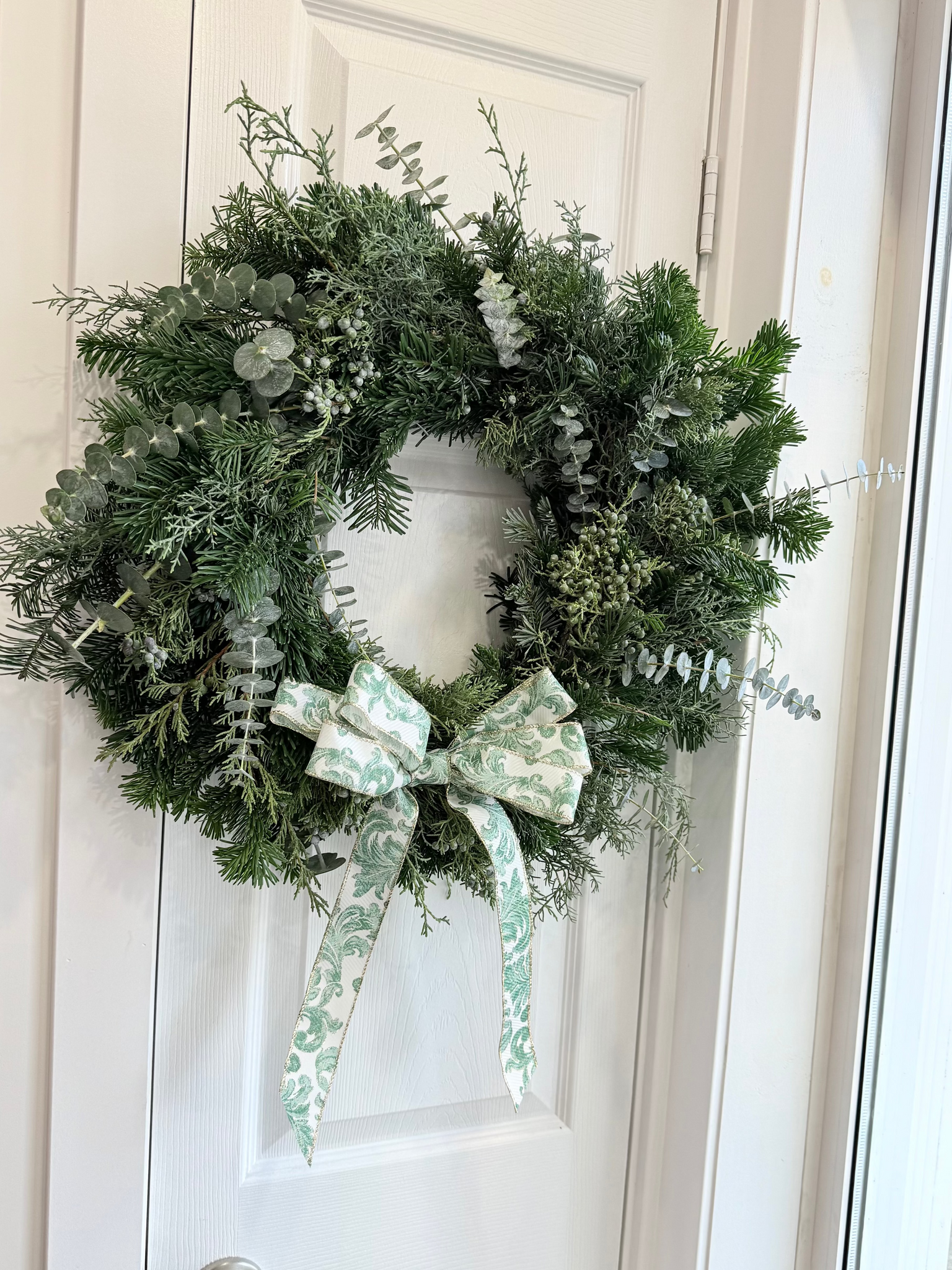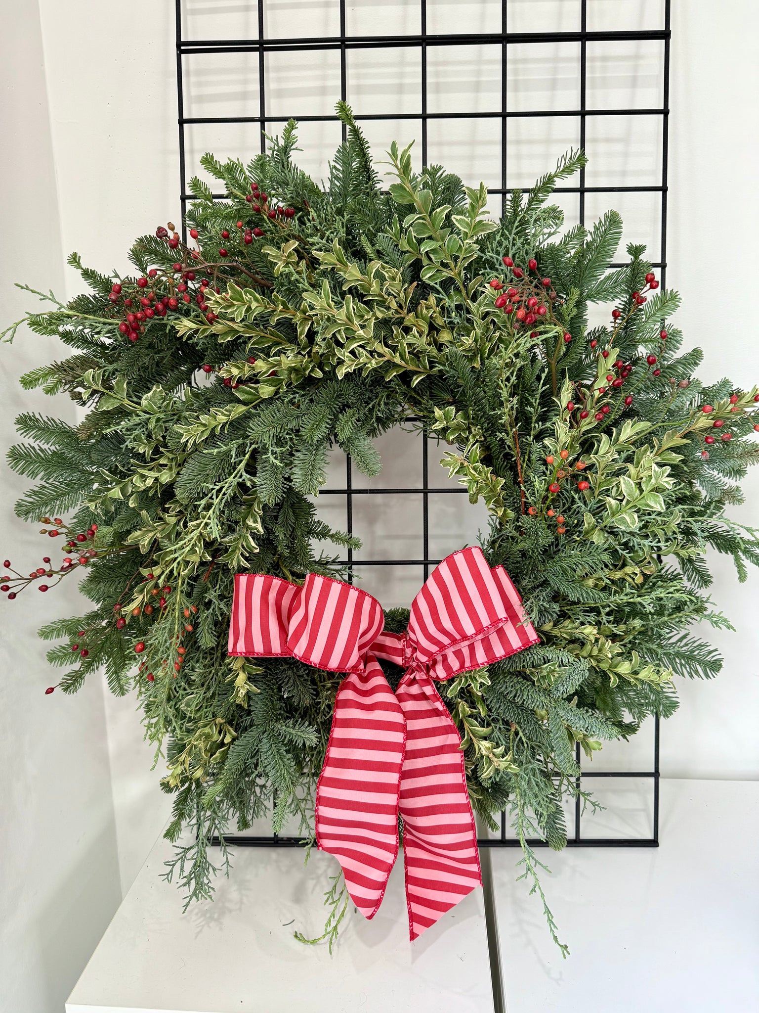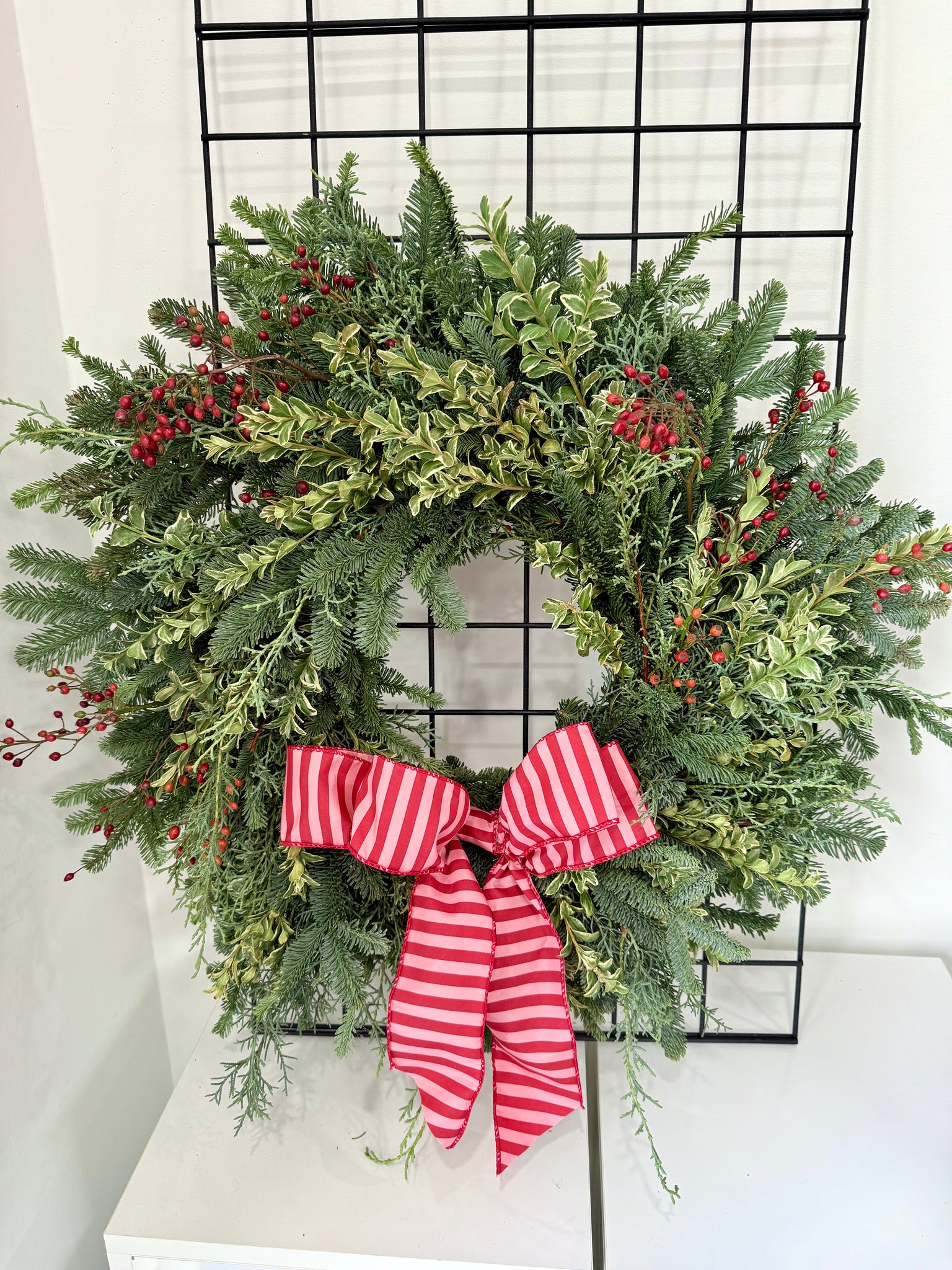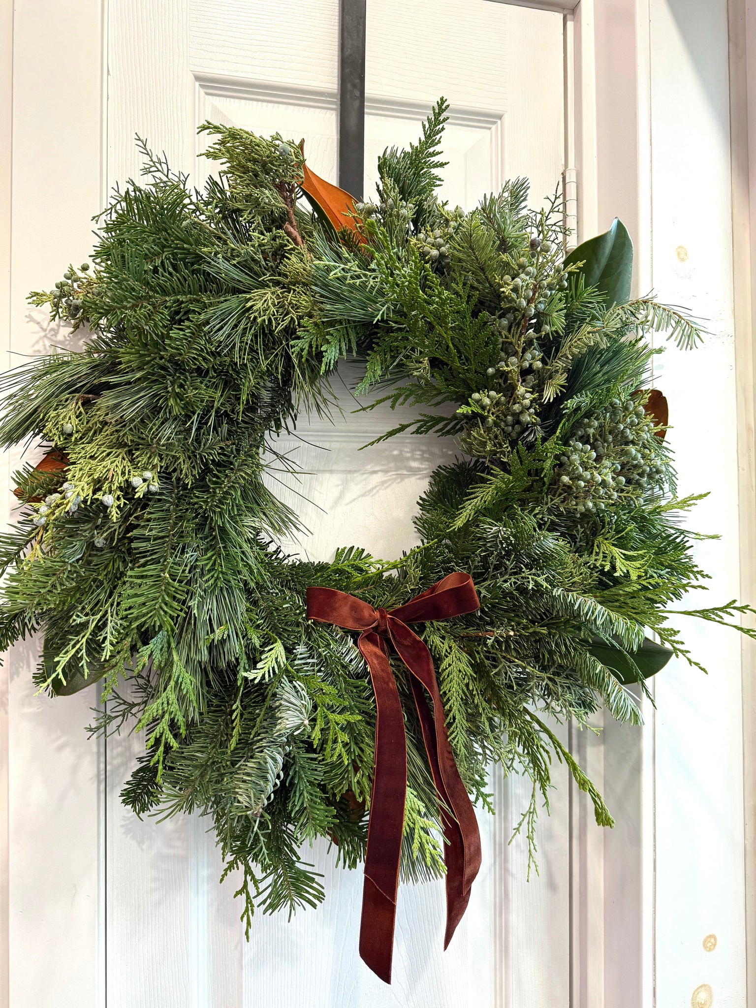 WINTERLAND: Noble fir, cedar, berried juniper, magnolia tips, pine, Carolina sapphire, and a ribbon bow.