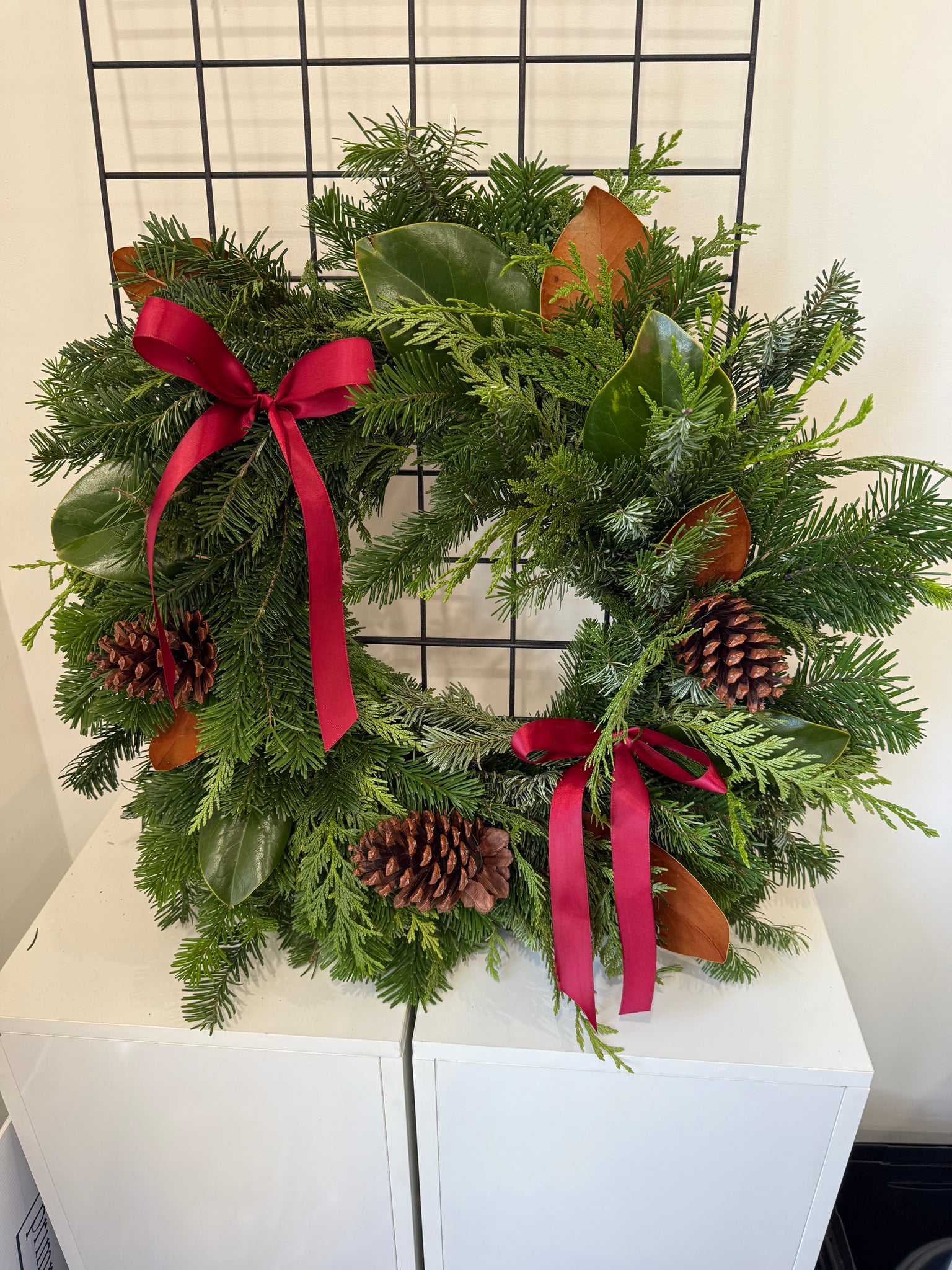 BOWTIFUL: Noble fir, cedar, magnolia tips, pinecones and ribbon bows.